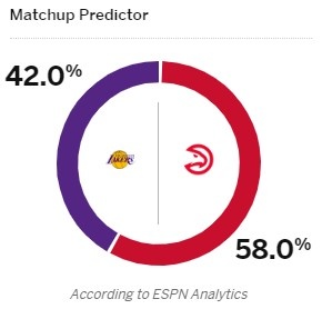 Today, ESPN predicts the winning rate of this game. The Lakers will not have the upper hand at 42.0% and the Hawks will be at 58.0%.
