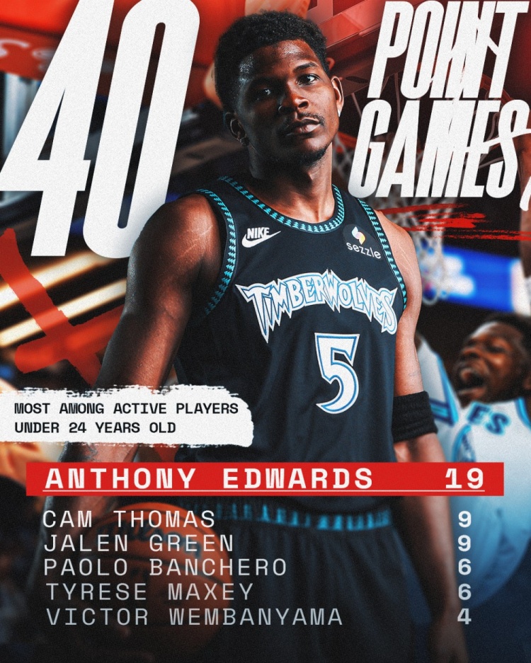 NBA Indonesian branch social media account showed Edwards' scoring performance. Huazi, 24, has played 19 solo performances with 40+ points.