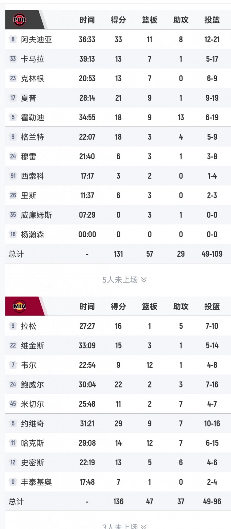In this campaign, the two sides fought fiercely, and the pace of the game was fast. The Heat took 96 shots and hit 49 goals, while the Trail Blazers took 109 shots and also hit 49 goals.
