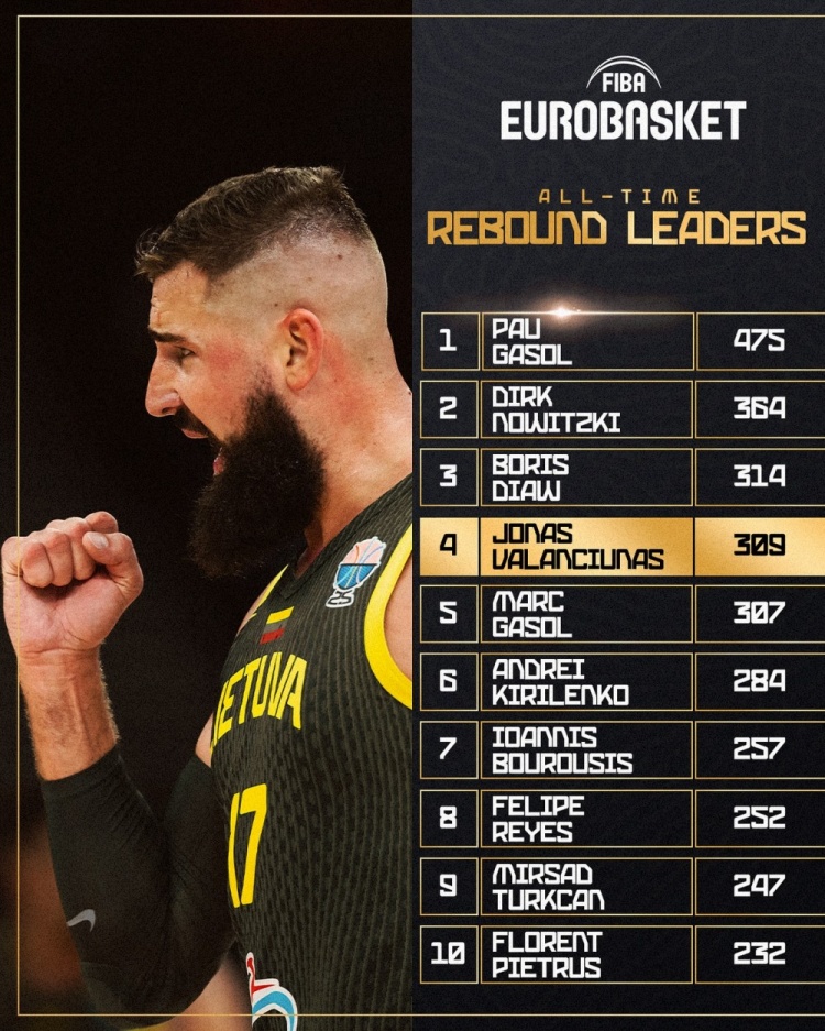 In this way, his total rebounds in the European Championship reached 309, surpassing Gasol Jr.'s 307 and rising to the fourth place in European Championship history. The top three are: 475 of Gasol, 364 of Nowitzki and 314 of Boris Dior.