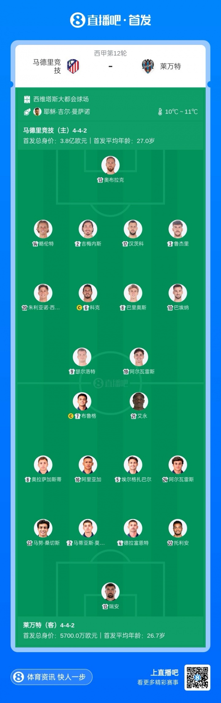 In the 12th round of La Liga, Atletico Madrid played against Levante, and the starting lineup was announced before the game.