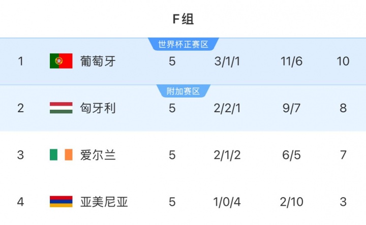 Portugal currently leads the World Cup qualifying group standings with 10 points. In the final round of the home match against Armenia, which is at the bottom, Portugal only needs to win to secure qualification for the World Cup. If Hungary fails to win, Portugal can ensure direct advancement even with a draw.