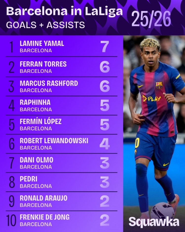 According to Squawka statistics, five Barcelona players have scored 5+ goals in the league this season, making them the first team in the five major leagues.