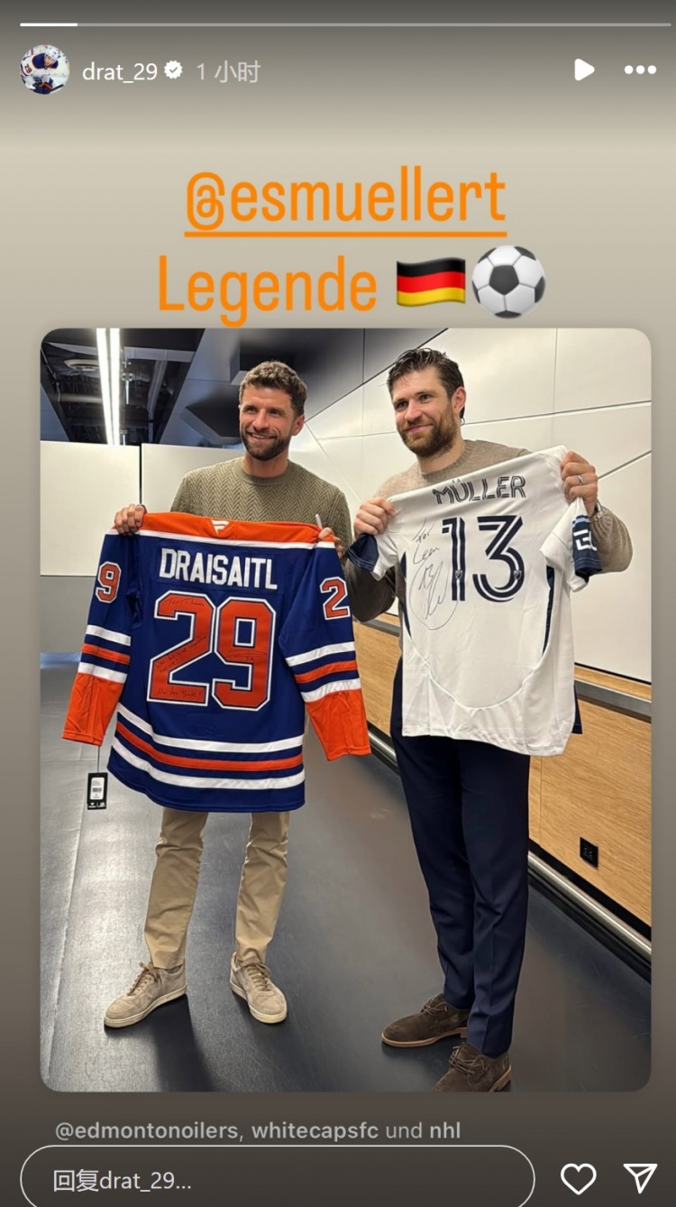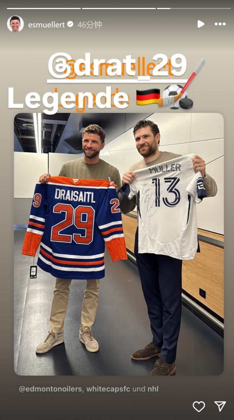 Muller exchanged jerseys with German hockey player Dreisettel and took a photo. The latter played for the NHL Edmonton Oilers and was also a striker. The two forwards photos on social media and call each other a legend.
