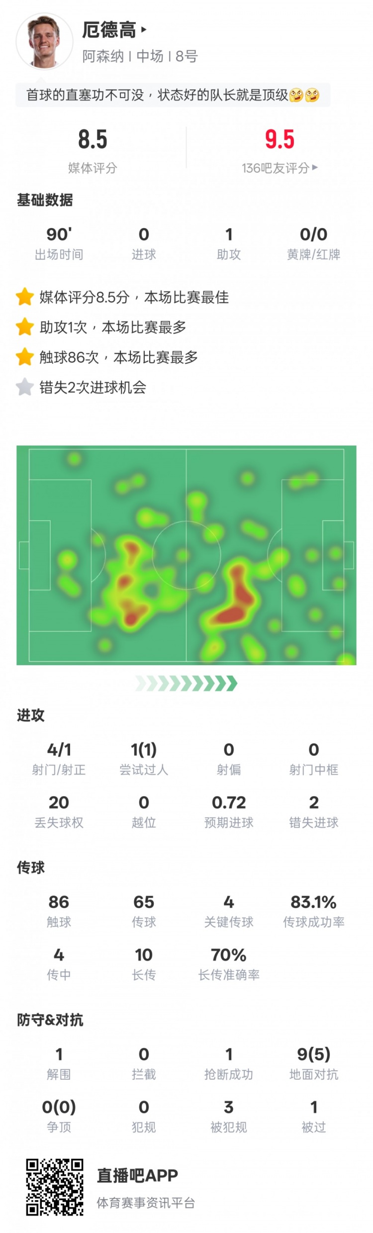 In this game, Odegao played the whole game for Arsenal and gave 1 assist. Arsenal officially announced that after the fans' vote, Odegao was elected the best player in the team in this game.
