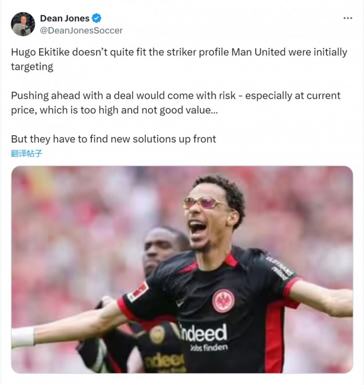 reporter Dean Jones posted a social media article, talking about the rumors that Manchester United intends to introduce Frankfurt striker Ekitic.