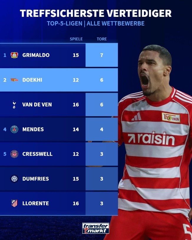 The five major European leagues have some players with the attributes of defenders. Grimaldo, Doxey and others are the best among them. The German transfer market has taken stock of the defenders who have scored the most goals in the five major leagues this season. Grimaldo leads the way with 7 goals, and Doxey and Van der Ven are tied for second with 6 goals.