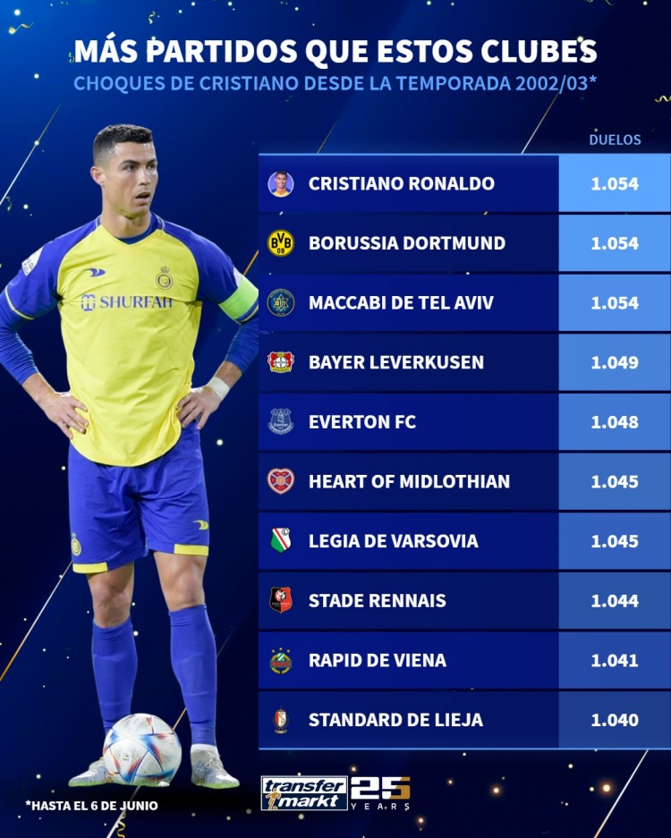 Since the 2002-03 season, Ronaldo has participated in 1,054 games, more than Leverkusen and Everton