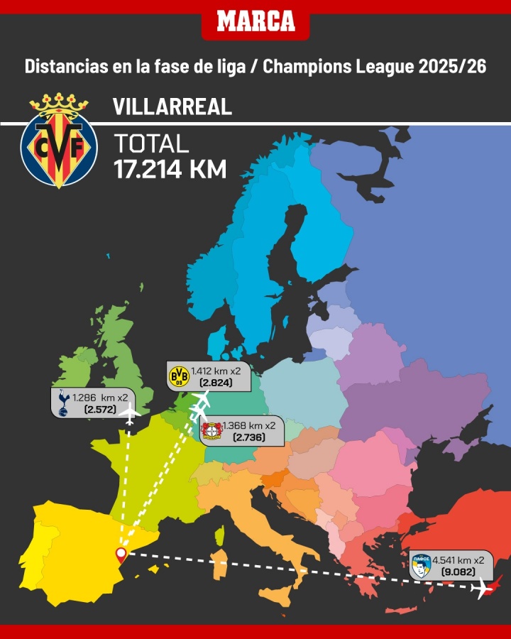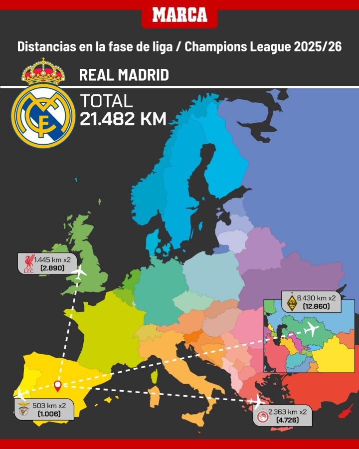 The 5 La Liga teams are away from the Champions League: Real Madrid is the farthest 21,500 kilometers, and Barcelona is 11,000 kilometers