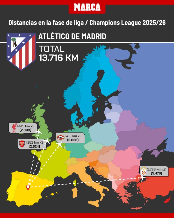Atletico Madrid Champions League round-trip distance: 13716 km