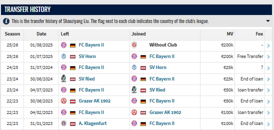 Previously, German transfers showed that Liu Shaoziyang left Austrian second-tier team SV Horn freely and "joined" Bayern second-tier team.