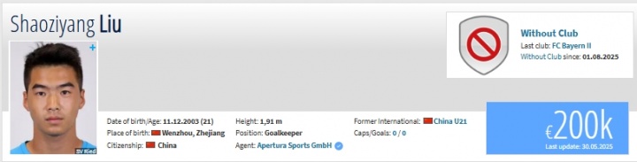 German transfer shows that Chinese player Liu Shaoziyang has left the team from Bayern's second team and has returned to freedom.